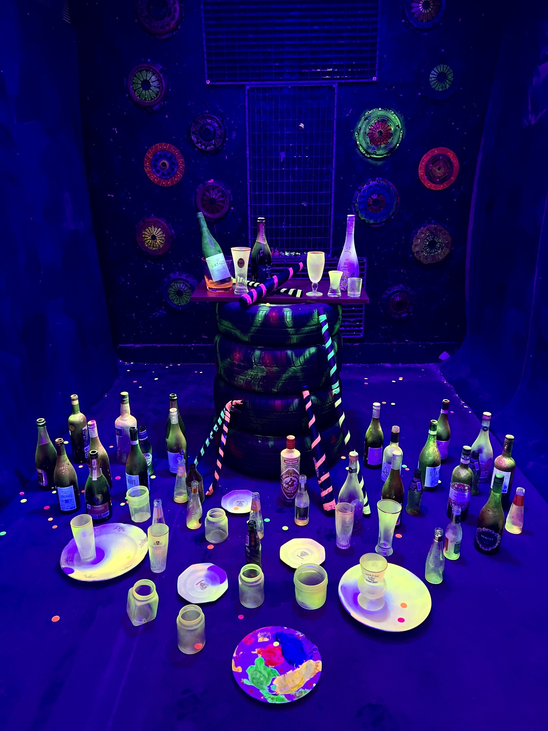 Laat jullie volledig gaan met lichtgevend servies en flessen in een kamer waar werkelijk alles oplicht. Beleef een unieke, knallende glow-ervaring die je nergens anders vindt!
